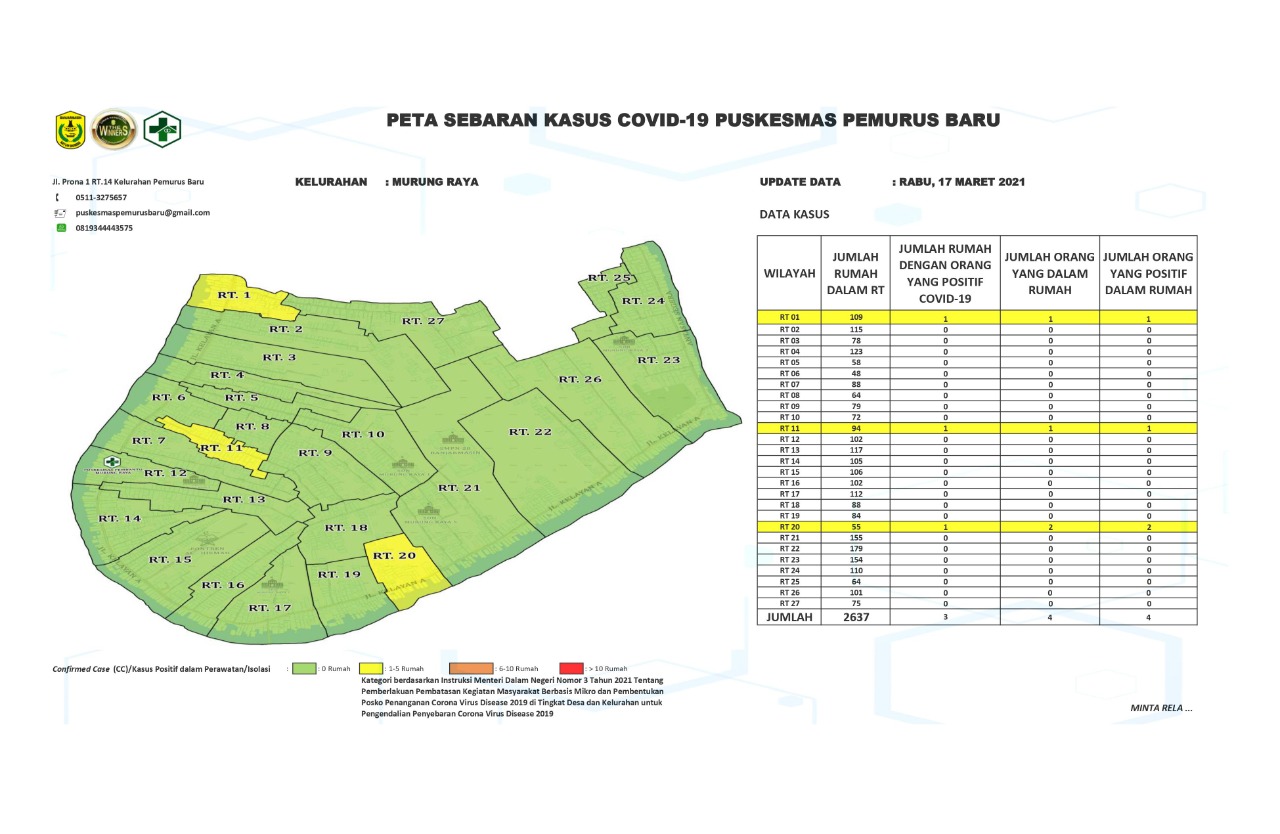 Update Data Dari Puskesmas Pemurus Baru 17 Maret 2021 Tentang Penyebaran Covid-19 di Kelurahan Murung Raya , Ada 3 Tiga RT di Kelurahan Murung Raya Yaitu RT.01 ,RT.11 dan RT.20 , Masing-Masing RT Yang Positif Terjangkit Virus Corona ada 1 Orang .